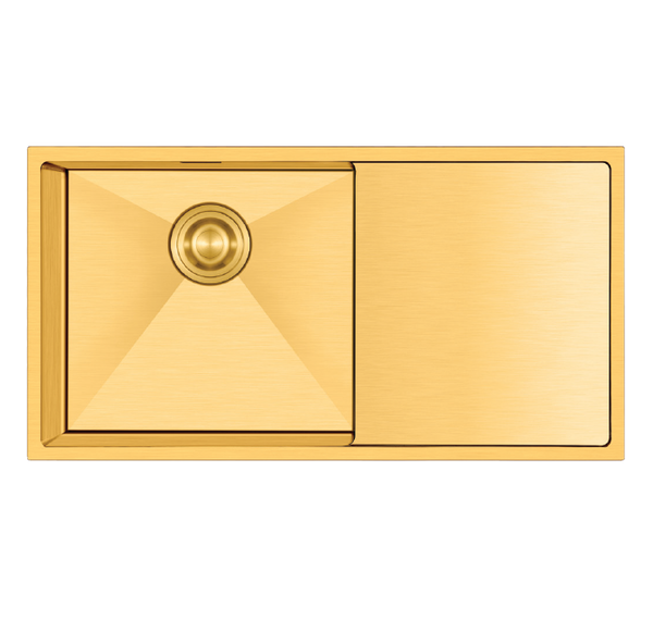 86×45 cm | 45 cm’lik dikdörtgen PVD Gold hazne; mutfakta solmayan ihtişamlı renk ve bakteri tutmayan yüzey.